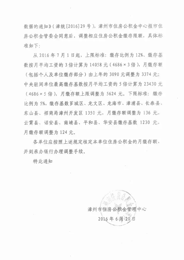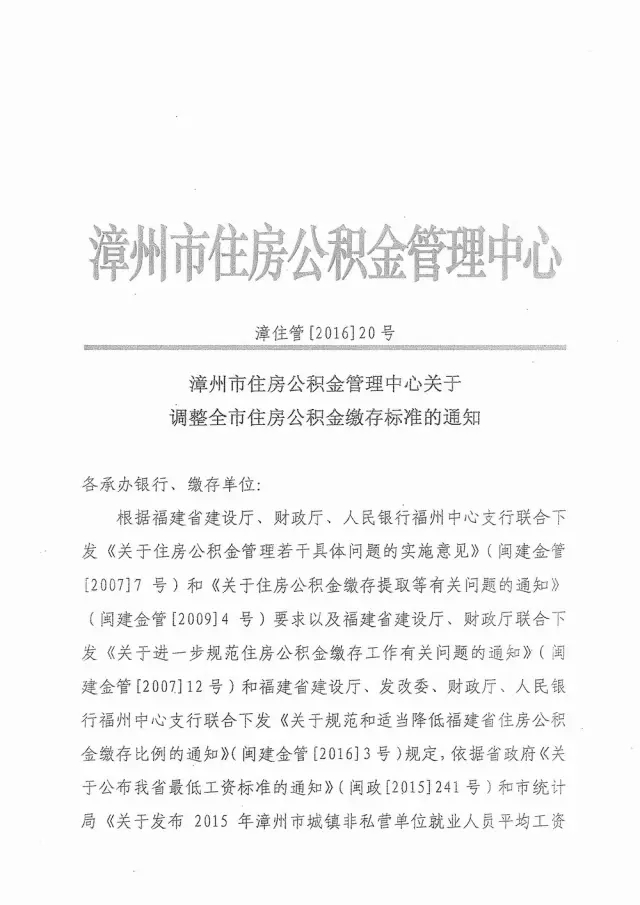 關(guān)于調整漳州市住房公積金繳存標準的通知
