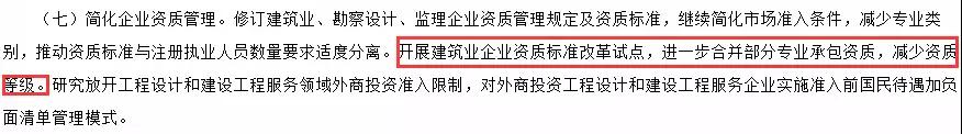 《2018年工作要點(diǎn)》中明確表示:繼續簡(jiǎn)化市場(chǎng)準入條件,減少專(zhuān)業(yè)類(lèi)別;開(kāi)展建筑業(yè)企業(yè)資質(zhì)標準改革試點(diǎn),進(jìn)一步合并部分專(zhuān)業(yè)承包資質(zhì),減少資質(zhì)等級。