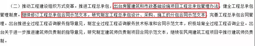 《2018年工作要點(diǎn)》指出:推進(jìn)工程總承包,出臺房屋建筑和市政基礎設施項目工程總承包管理辦法。