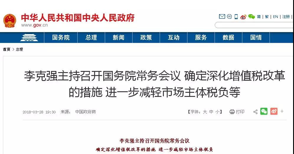 2018年3月28日國務(wù)院常務(wù)會(huì )議決定,將制造業(yè)等行業(yè)增值稅稅率從17%降至16%,將交通運輸、建筑、基礎電信服務(wù)等行業(yè)及農產(chǎn)品等貨物的增值稅稅率從11%降至10%,預計全年可減稅2400億元。
