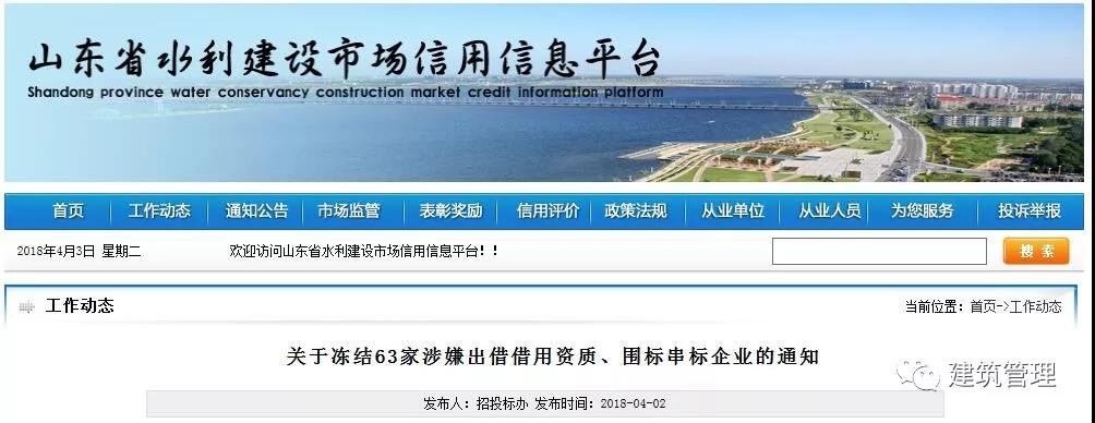 近日,山東省住建廳發(fā)現63家企業(yè)在水利建設市場(chǎng)招標投標活動(dòng)中涉嫌出借借用資質(zhì)、圍標串標。